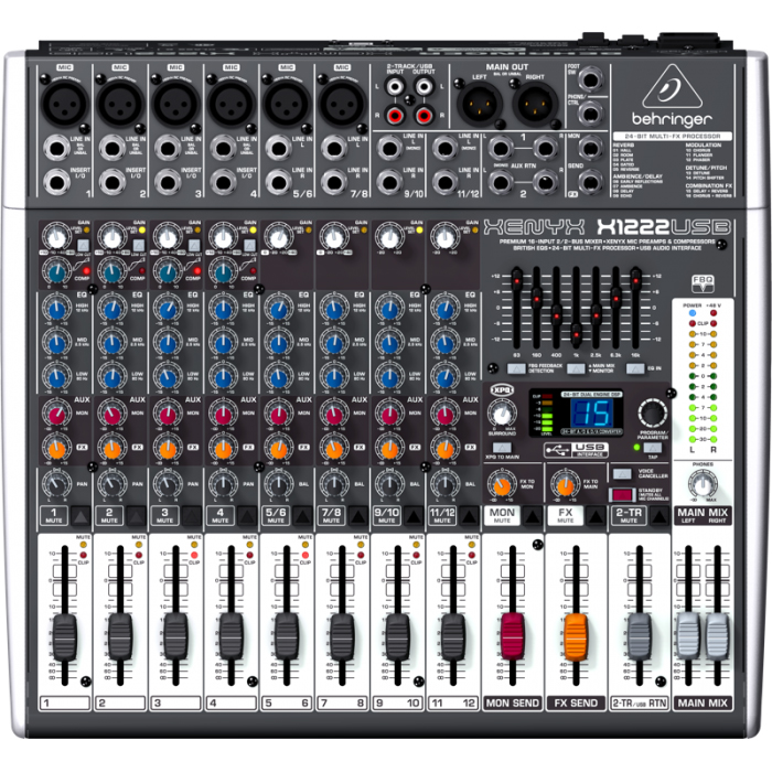 The QX1222USB is a step up from the QX1204USB with six mono mic inputs. These two additional channels can also be used for stereo line-level devices, such as keyboards or sound modules. The QX1222USB also comes equipped with channel Inserts for inputs 1-4, a stereo 7-band graphic EQ, which can be assigned to the main or monitor buses, and our proprietary FBQ Feedback Detection System. Other features include full-sized faders for MON and FX SENDs, our XPQ 3D stereo surround effect (creates a broader, enhanced stereo image), and a handy Voice Canceller function for removing vocals from pre-recorded tapes and CDs for “instant-karaoke” applications.